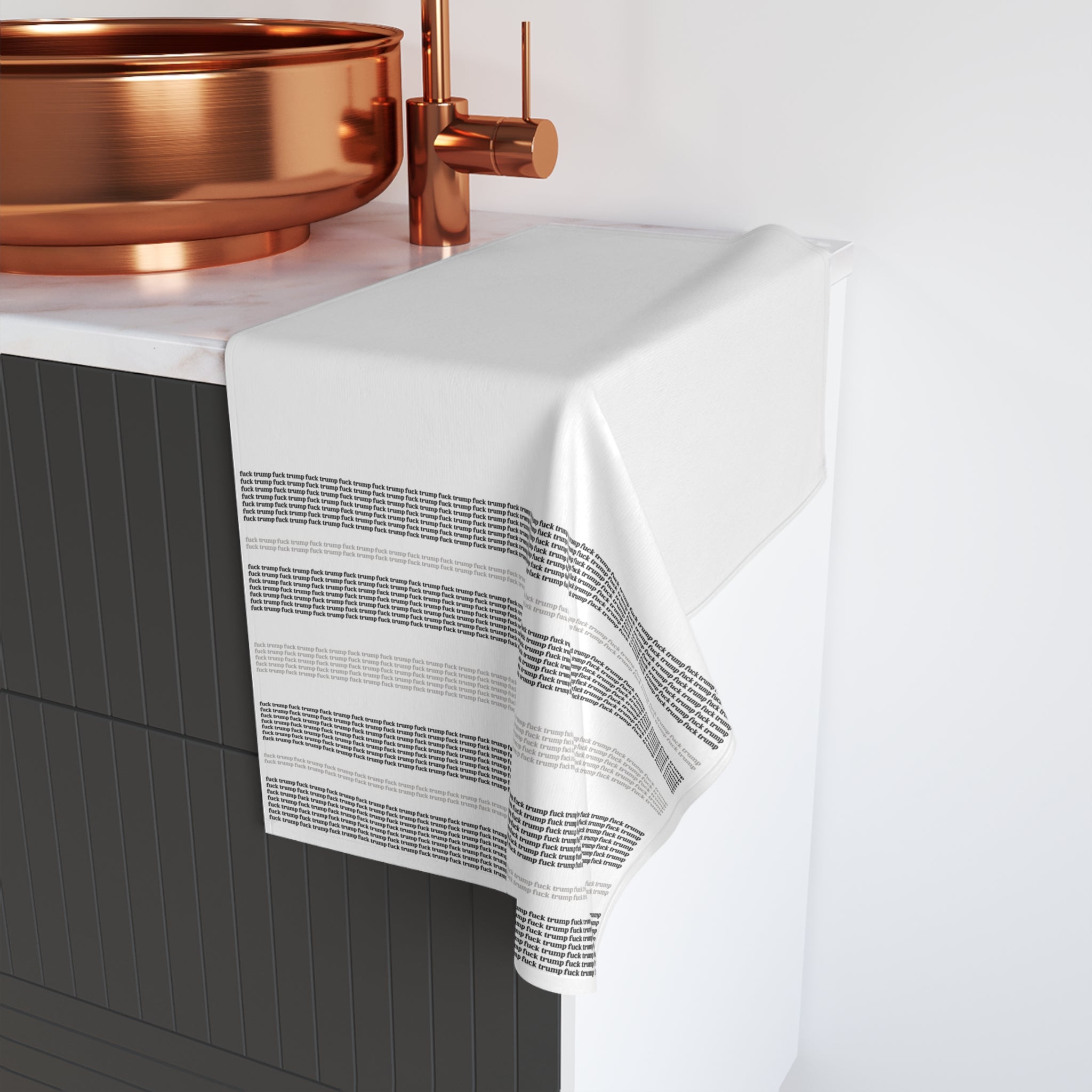 Add a subtle dose of rebellion to your space with this minimalist “F*ck Trump” hand towel—perfect for your bathroom, kitchen, or as a gift for your favorite liberal. It’s soft, functional, and printed with a little protest.