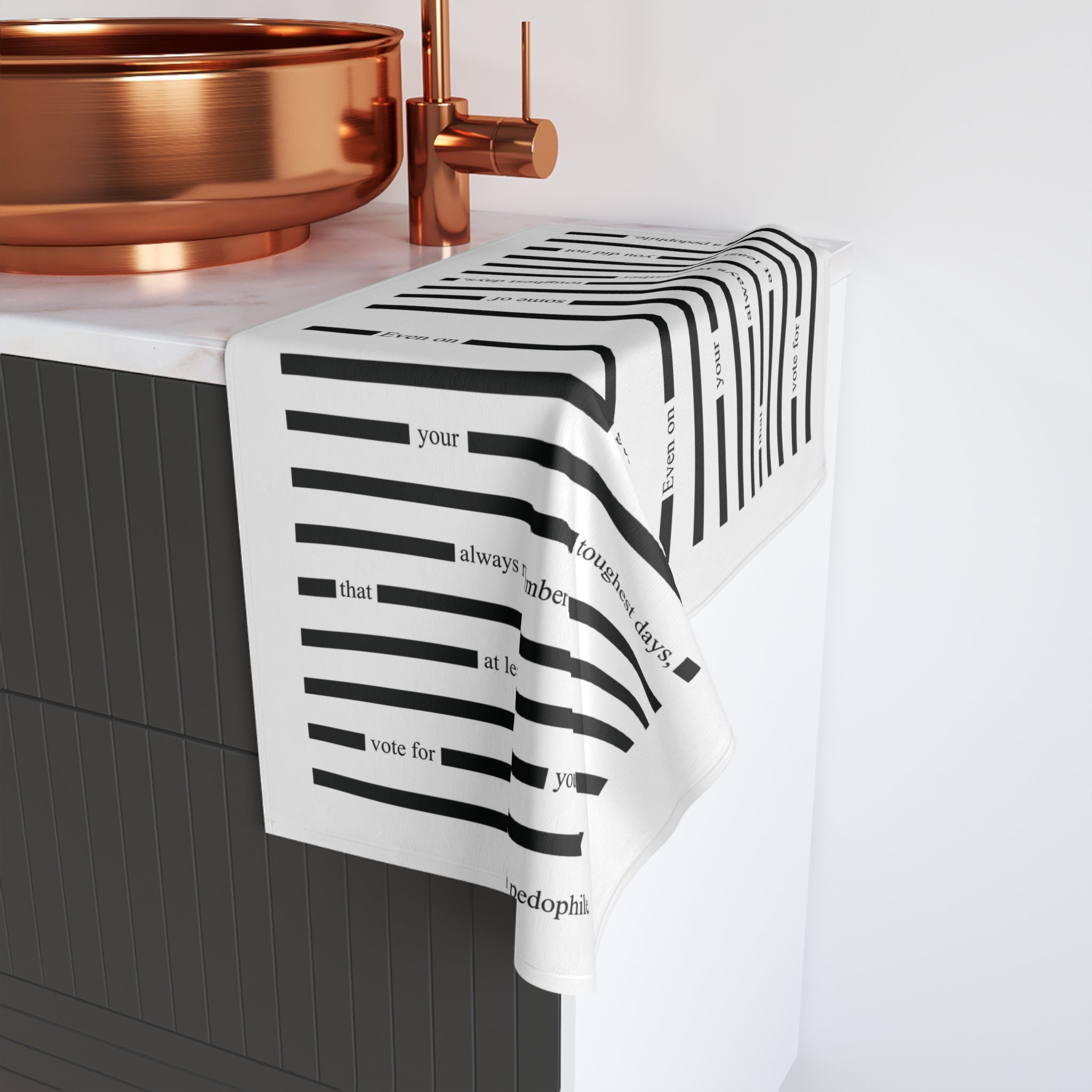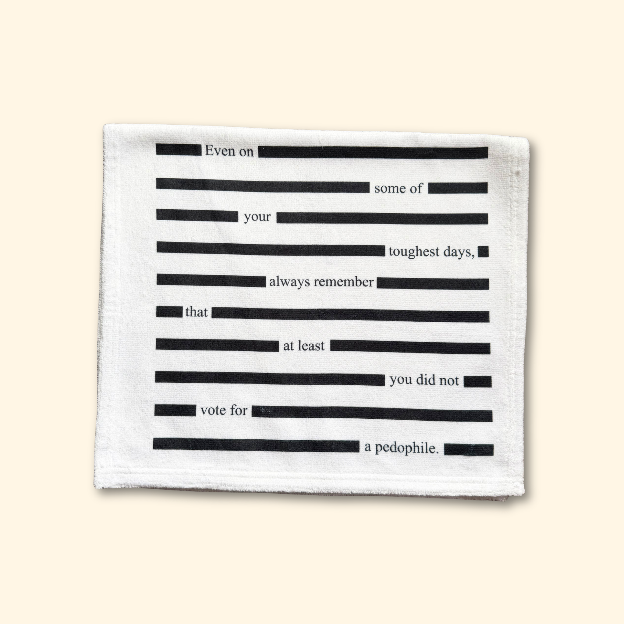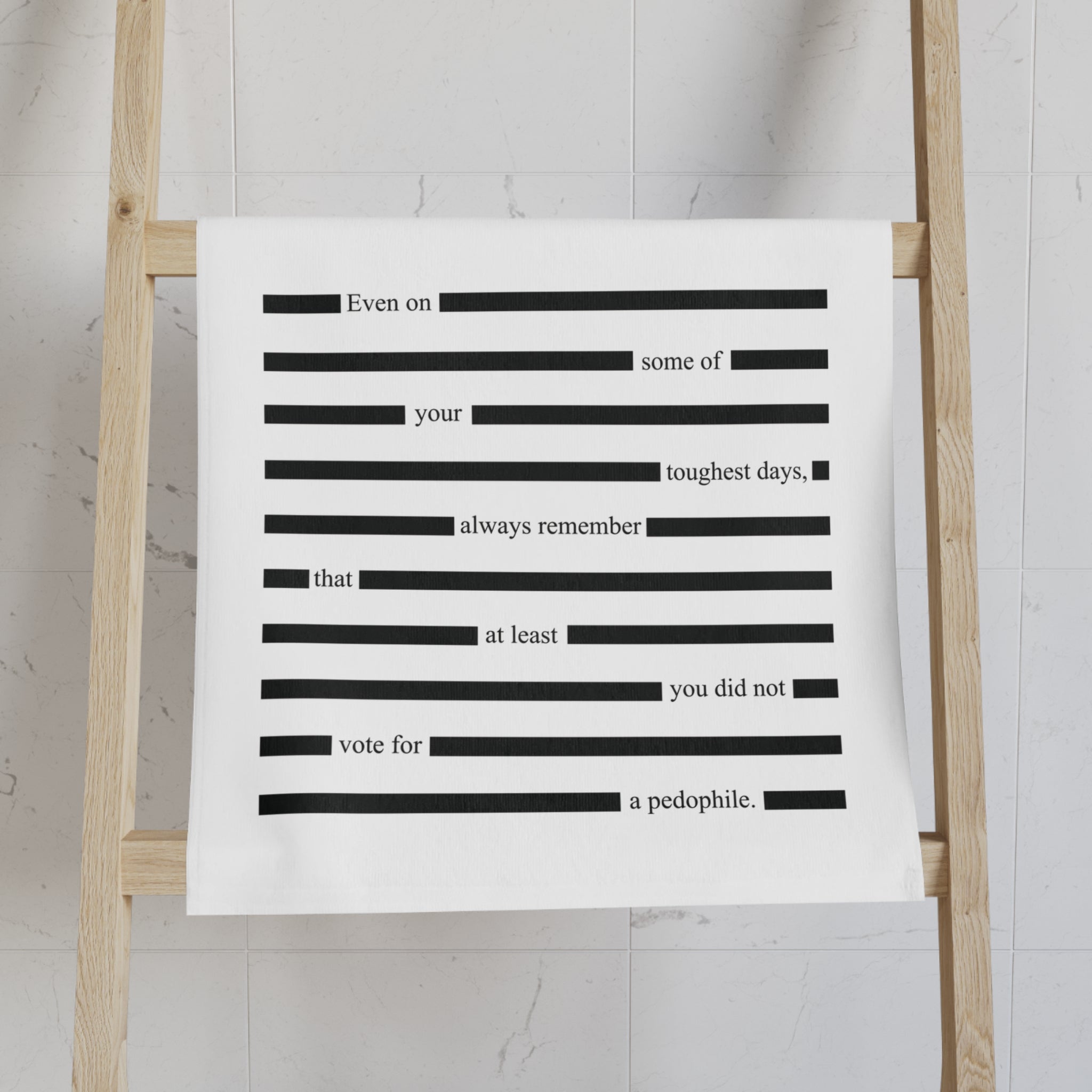 Even on some of your toughest days, remember that at least you didn’t vote for a pedophile. The Redacted Epstein Files F*ck Trump Hand Towel channels that sentiment into bold, darkly humorous progressive home décor—featuring a redacted document–inspired design that makes a sharp political statement and a memorable conversation starter for kitchens or bathrooms.